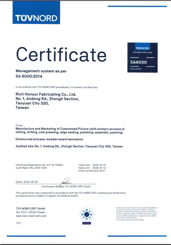 RHF 鴻僑家具 SA8000 證書